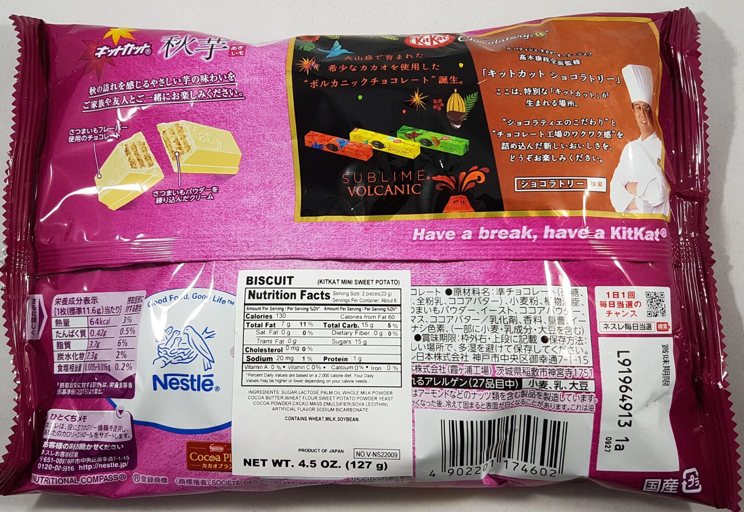 Sweet Potato Kit Kat Mini Ingredients: sugar, vegetable oil, whole milk powder, flour, lactose, cocoa butter, sweet potato powder, cocoa powder, yeast, emulsifier, fragrance, baking soda, yeast food, coloring (carotenoid), (some of the raw materials include soy and wheat)